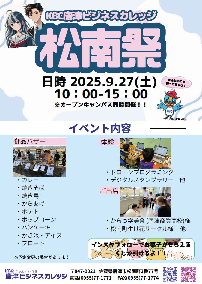 さて、9月27日(土)は唐津ビジネスカレッジの学園祭である「松南祭」を開催します。