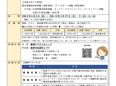 IT分野の基礎的な知識から応用技術を習得し、資格取得して事務職等への就職を目指します。 パソコン未経験者の方、再就職に向けてステップアップしたい方【これまでの資格取得の実績】日商PC検定試験...